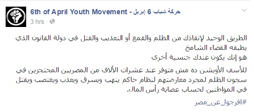 وكتبت الحركة، في منشور لها عبر صفحتها الرسمية على موقع “فيس بوك”: “الطريق الوحيد لإنقاذك من الظلم والقمع أو التعذيب والقتل في دولة القانون الذي يطبقه القضاء الشامخ، هو أنك يكون عندك جنسية أخرى”.