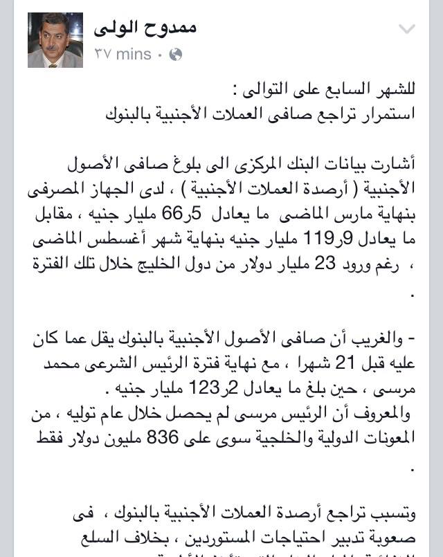 وأضاف الولي: “الغريب أن صافي الأصول الأجنبية بالبنوك يقل عما كان عليه قبل 21 شهرا، مع نهاية فترة حكم الرئيس محمد مرسي، حين بلغ ما يعادل 2.123 مليار جنيه، والمعروف أن الرئيس مرسي لم يحصل خلال عام توليه، من المعونات الدولية والخلجية سوى على 836 مليون دولار فقط”.