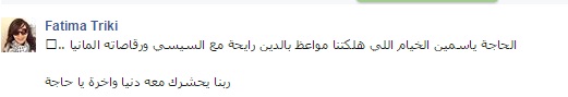 وعلقت الإعلامية بقناة الجزيرة فاطمة التريكي على الصورة قائلةً: “الحاجة ياسمين الخيام اللي هلكتنا مواعظ بالدين رايحة مع السيسي ورقاصاته ألمانيا.. ربنا يحشرك معه دنيا وآخرة يا حاجة”.