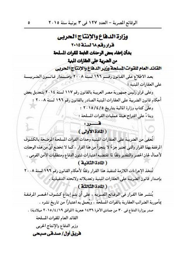 وجاء في القرار الذي نشر بجريدة الوقائع المصرية، الذي يحمل رقم 68 لسنة 2015، بألا تخضع أي من الوحدات الواردة في الكشف المرفق بالقرار، إلى لجان الحصر والتقدير “المشكلة من وزارة المالية لتحديد قيمة الضريبة”، وفقا لما تقتضيه اعتبارات شؤون الدفاع والأمن القومي.