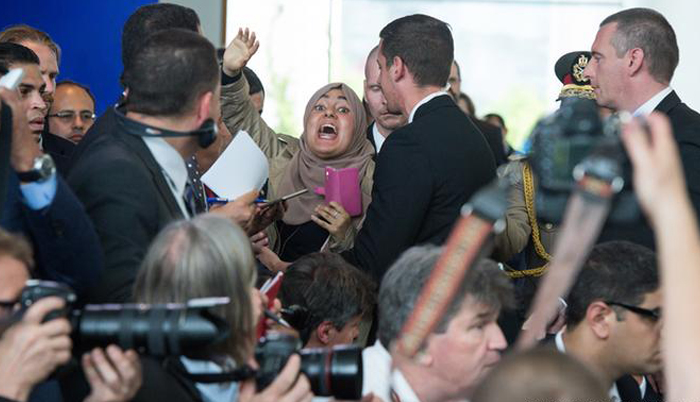 فاجأت طالبة مصرية، تدرس الطب في ألمانيا، الجميع في المؤتمر الصحفي المشترك بين السيسي وميركل وصرخت بأعلى صوتها: “يسقط يسقط حكم العسكر” و”أنت نازي”، وعبارات أخرى مناهضة للسيسي، مما اضطر المستشارة الألمانية لإنهاء المؤتمر الصحفي قبل أن تكمل حديثها، كما اضطر مؤيدو السيسي للهتاف “تحيا مصر”، محاولين التغطية على هتاف العادلي.