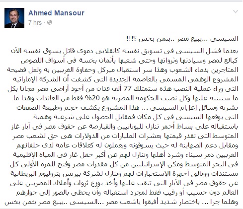 وأردف: “كما أنه فتح للمرة الأولى كل مستندات ووثائق أجهزة الاستخبارات لهم، وتنازل لشركة بيرتش بتروليوم البريطانية عن حقوق مصر في الآبار التي تنقب عليها، وأخذ يوزع ثروات وأملاك المصريين على العالم دون حسيب أو رقيب فقط لمجرد استقباله وأن يحظى بالصور إلى جوارهم وهلما جرا.. باختصار شديد أفيقوا يا شعب مصر.. السيسي يبيع مصر بثمن بخس”.