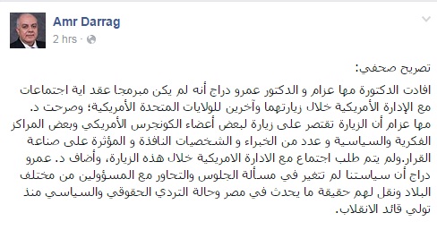 وفي بيان صحفي نشره د.عمرو دراج، عضو المجلس الثوري، عبر صفحته الرسمية على موقع “فيس بوك” قال: ” لم يكن مبرمجا عقد اية اجتماعات مع الإدارة الأمريكية خلال زيارت أعضاء المجلس للولايات المتحدة الأميركية.