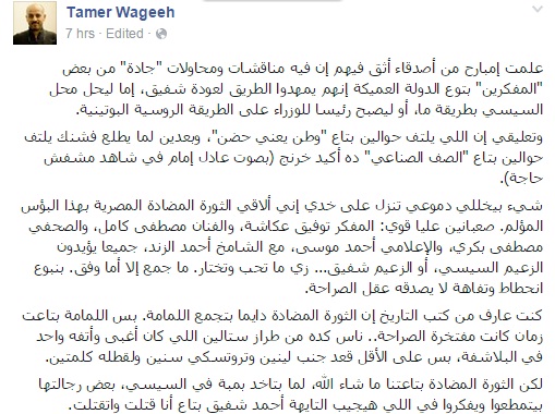 وأضاف وجيه، في منشور له عبر صفحته الرسمية على موقع “فيس بوك”: “علمت إمبارح من أصدقاء أثق فيهم أن هناك مناقشات ومحاولات جادة من بعض المفكرين بتوع الدولة العميقة إنهم يمهدوا الطريق لعودة شفيق، إما ليحل محل السيسي بطريقة ما، أو ليصبح رئيسا للوزراء على الطريقة الروسية البوتينية”.
