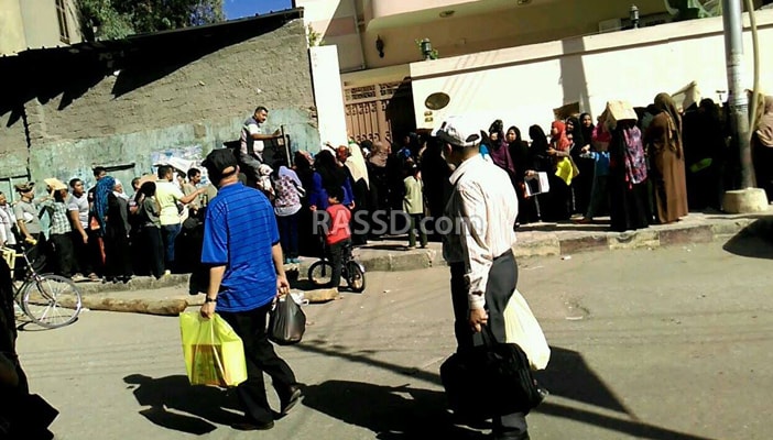 والتقطت عدسة “رصد” صوراً لتكدس المواطنين أمام منافذ التوزيع، حيث قال محمد عثمان: “إحنا قرفنا من المعاملة السيئة من صاحب المكان، إحنا جايين ناخد حقنا مش جايين علشان نتهان”.
