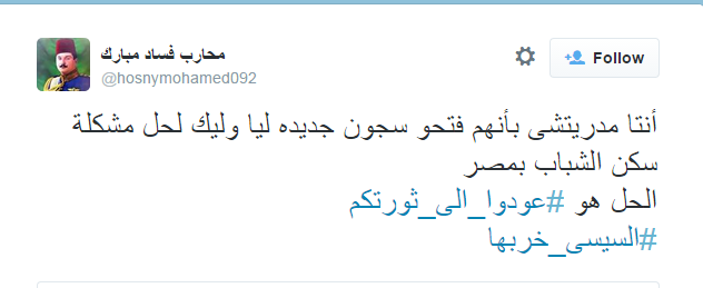 وسادت حالة من السخرية والاستياء، بين رواد موقع التواصل الاجتماعي، عقب ذلك القرار؛ فعلق hosnymohamed ساخرًا: “إنت مدريتشي بأنهم فتحوا سجون جديدة ليا وليك لحل مشكلة سكن الشباب بمصر الحل هو #عودوا_إلى_ثورتكم.. #السيسى_خربها”.