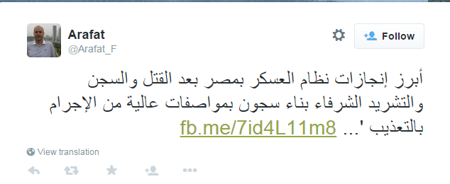 وتابع Arafat Fayyad ساخرًا: “أبرز إنجازات نظام العسكر بمصر بعد القتل والسجن والتشريد للشرفاء بناء سجون بمواصفات عالية من الإجرام بالتعذيب، بحيث لا يخرج منها إلا من كتب الله له البقاء”.