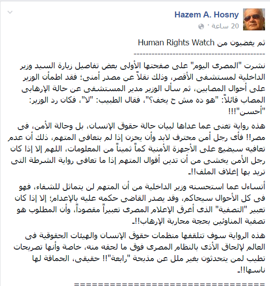 وقال -عبر منشور له على “فيس بوك”-: “نشرت “المصري اليوم” على صفحتها الأولى بعض تفاصيل زيارة السيد وزير الداخلية لمستشفى الأقصر، وذلك نقلاً عن مصدر أمني؛ فقد اطمأن الوزير على أحوال المصابين، ثم سأل الوزير، مدير المستشفى، عن حالة الإرهابي المصاب قائلاً: “هو ده مش ح يخف؟”، فقال الطبيب: “لا”، فكان رد الوزير: “أحسن!!”.