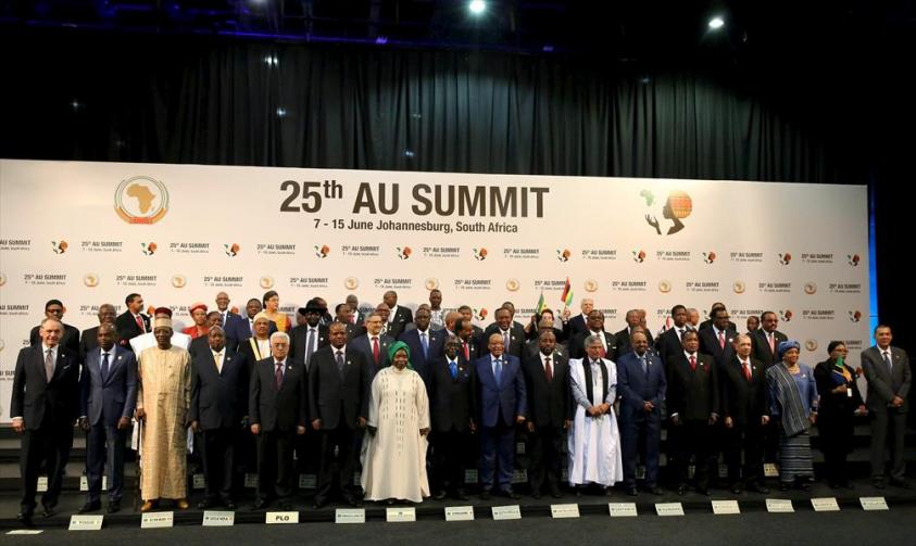 ظهر الرئيس السوداني، عمر البشير، ببدلة زرقاء اللون، في الصف الأول بالقمة الإفريقية بجنوب إفريقيا لالتقاط الصورة التذكارية، إلى جانب القادة المشاركين رغم وقوفه في دولة عضوة بالمحكمة الجنائية الدولية التي توجه له تهم جرائم حرب.