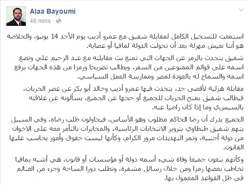 وقال بيومي، في منشور له عبر صفحته الرسمية على موقع “فيس بوك”، إن حوار شفيق بالأمس يدل على أن الشعب يعيش “مهزلة بعد أن تحولت الدولة لمافيا أو عصابة”، مضيفًا أن “شفيق يتحدث بالرمز عن الجهات التي تمنع بث مقابلته مع عبد الرحيم علي وتضع اسمه على قوائم الممنوعين من السفر، ويطالب بالعودة لمصر”.