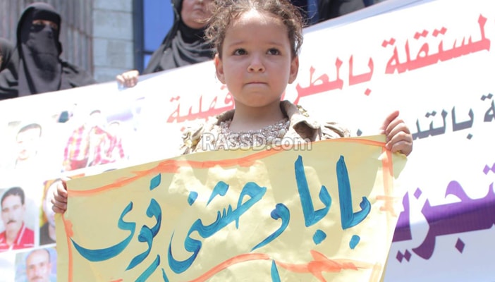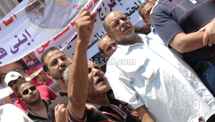 حمل أبناء الصيادين، لافتات تطالب بالإفراج عن آبائهم، فيما حملت طفلة لافتة تقول: “بابا وحشني قوي حرام عليكم.. ابن صياد ومسجون”.