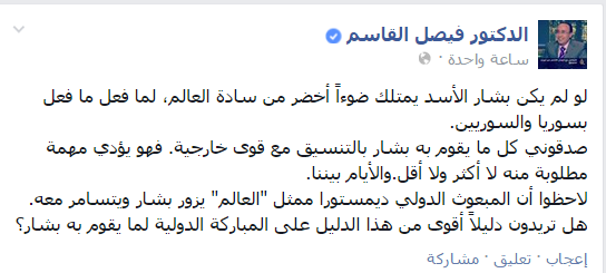 أكد الكاتب السوري، فيصل القاسم، أن بشار الأسد، لو لم يكن يمتلك ضوءًا أخضر من سادة العالم، لما فعل ما فعل بسوريا والسوريين.