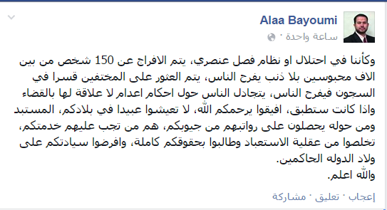 وقال -عبر منشور له على موضع التواصل الاجتماعي “فيس بوك”-: “يتم الإفراج عن 150 شخصًا من بين الآف محبوسين بلا ذنب يفرح الناس، يتم العثور على المختفين قسرًا في السجون فيفرح الناس، يتجادل الناس حول أحكام إعدام لا علاقة لها بالقضاء وإذا كانت ستطبق”.