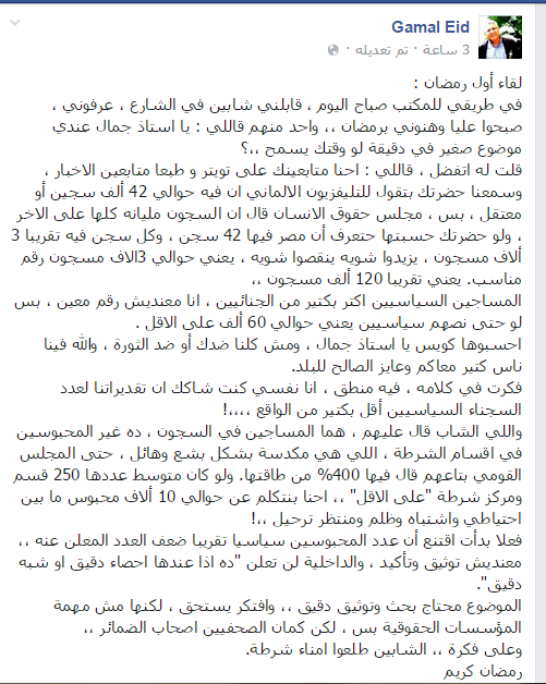 أعرب الناشط الحقوقي، مدير الشبكة العربية لمعلومات حقوق الإنسان، عن اقتناعه بأن عدد المحبوسين سياسيًا، ضعف العدد الذي كان قد أعلن عنه، وهو 42 ألف سجين، مضيفًا "معنديش توثيق وتأكيد، والداخلية لن تعلن ده، إذا عندها إحصاء دقيق..