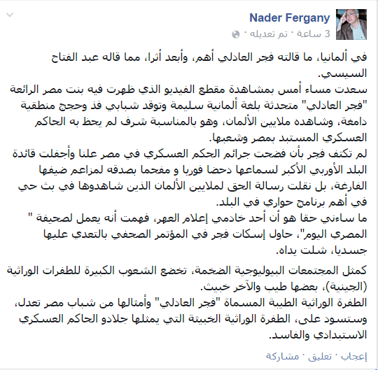 وأضاف “لم تكتف فجر بأن فضحت جرائم الحكم العسكري في مصر علنًا وأجفلت قائدة البلد الأوروبي الأكبر لسماعها دحضًا فوريًا ومفحمًا بصدقه لمزاعم ضيفها الفارغة، بل نقلت رسالة الحق لملايين الألمان الذين شاهدوها في بث حي في أهم برنامج حواري في البلد”.