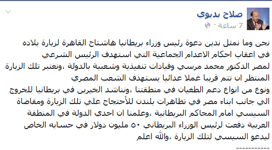 وقال “بديوي” عبر منشور له على “فيس بوك”: علمنا أن إحدى الدول في المنطقة العربية دفعت لرئيس الوزراء البريطاني ٥٠ مليون دولار في حسابه الخاص، ليدعو السيسي لتلك الزيارة”.