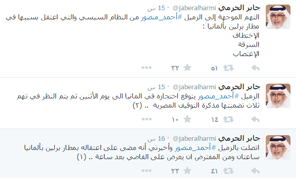 أكد رئيس تحرير جريدة الشرق القطرية السابق، جابر سالم الحرمي، أنّه اتصل بالإعلامي أحمد منصور وقت احتجازة من قبل السلطات الألمانية في مطار برلين، وأخبره أنه من المفترض ان يعرض على قاضي التحقيق.