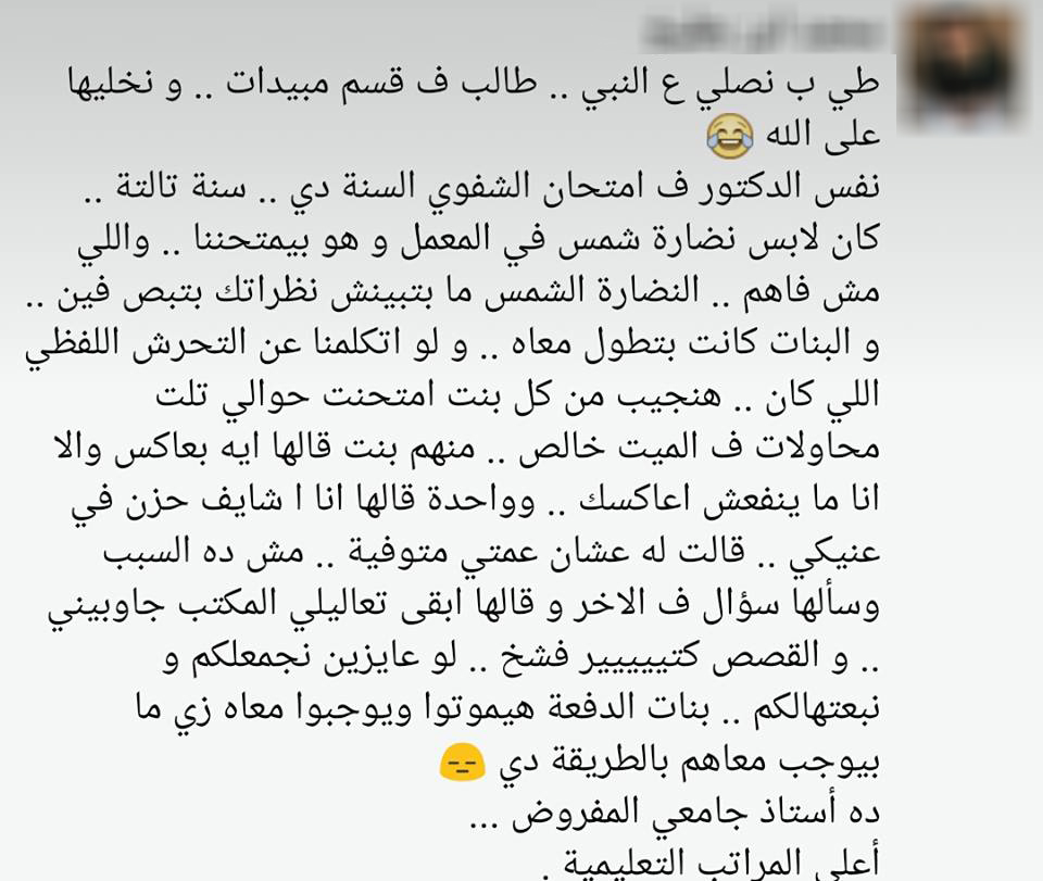 وأضافت الرسالة، أن الطالبة رفضت وذهبت لاستاذ في الجامعة لتشكوه، إلا أنه علم بذلك فذهب لها خلال امتحان “الفاينال”، وقال لها “انتي بتشتكيني؟”، وجعلها تكتب على ورقة غلاف المادة، قائلا “ابقى قابليني لو نجحتي”.