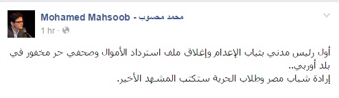 وكتب، في منشور له عبر صفحته الرسمية على موقع “فيس بوك”: “أول رئيس مدني بثياب الإعدام وإغلاق ملف استرداد الأموال وصحفي حر مخفور في بلد أوروبي.. إرادة شباب مصر وطلاب الحرية سيكتبون المشهد الأخير”.
