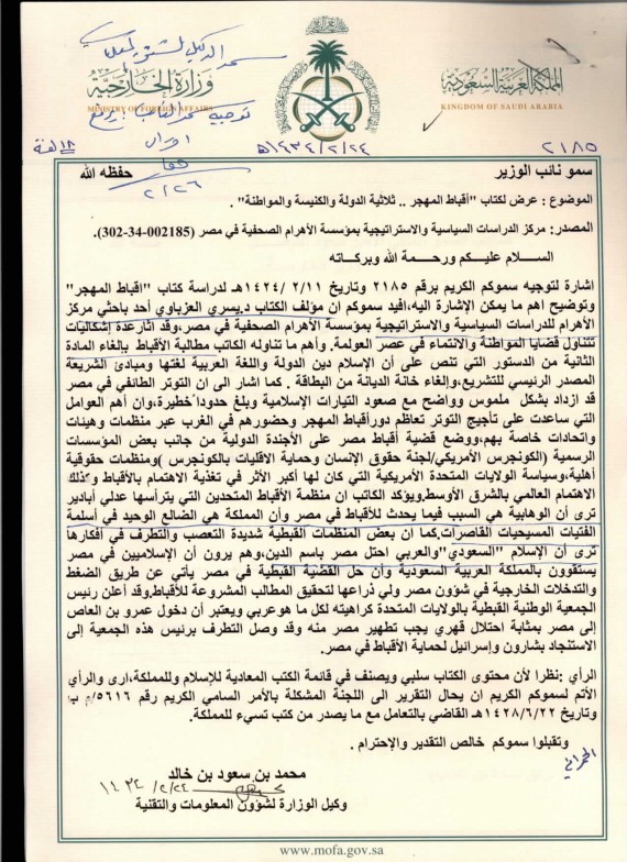 نشر موقع ويكيليكس، رسالة بتاريخ 13 إبريل عام 2003، من الأمير محمد بن سعود وكيل وزارة شؤون المعلومات والتقنية السعودية، إلى نائب وزير الخارجية؛ تضمنت عرض تقرير عن كتاب “أقباط المهجر.. ثلاثية الدولة والكنيسة والمواطنة”.