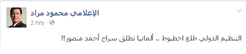 وقال مراد، في منشور له عبر صفحته الرسمية على موقع “فيس بوك”، إن “التنظيم الدولي طلع أخطبوط.. ألمانيا تطلق سراح أحمد منصور”.