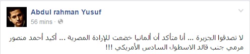 وكتب “يوسف”، خلال منشور له عبر صفحته الرسمية على موقع “فيس بوك”: “لا تصدقوا الجزيرة.. أنا متأكد أن ألمانيا خضعت للإرادة المصرية.. أكيد أحمد منصور مرمي جنب قائد الأسطول السادس الأميركي”.