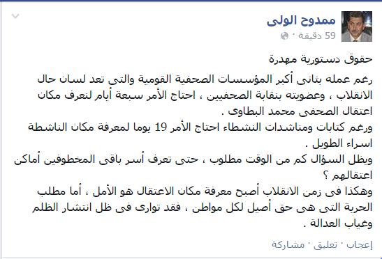 وقال -عبر منشور له على “فيس بوك”-: “رغم عمله بثاني أكبر المؤسسات الصحفية القومية والتي تعد لسان حال الانقلاب، وعضويته بنقابة الصحفيين، احتاج الأمر سبعة أيام لنعرف مكان اعتقال الصحفي محمد البطاوي”.