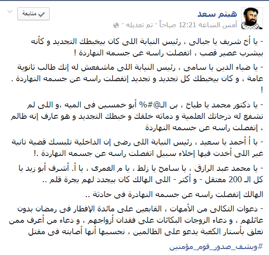 وعلق الناشط هيثم سعد، عبر “فيس بوك”: “يا أخ شريف يا جبالي، رئيس النيابة اللي كان بيخبطك التجديد وكأنه بيشرب عصير قصب، اتفصلت راسه عن جسمه النهارده!.. يا ضياء الدين يا سامي، رئيس النيابة اللي ماشفعش له إنك طالب ثانوية عامة، وكان بيخبطك كل تجديد وتجديد اتفصلت راسه عن جسمه النهارده!. يا دكتور محمد يا طباخ، بن الـ@#% أبو خمسين في الميه، واللي لم تشفع له درجاتك العلمية ودماثه خلقك وخبطك التجديد وهو عارف إنه ظالم، إتفصلت راسه عن جسمه النهارده!.