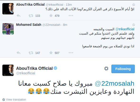 ورد أبو تريكة على صلاح قائلًا: “مبروك يا صلاح كسبت معانا النهارده وعايزين منك التيشرت”.