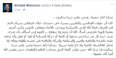وقال “منصور”، في منشور له عبر صفحته الرسمية على موقع “فيس بوك”: “الشكر لكم جميعا.. ونحن على دربنا سائرون.. كان أثر دعوات الصالحين والطيبين يسري في جسدي خلال اعتقالي سريان الدم في العروق، فملأ الله قلبي بالسكينة وروحي بالأمان وعقلي باليقين، وكنت أشعر بمعية إلهية تلازمني”.