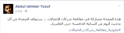 أعلن الشاعر والكاتب عبدالرحمن يوسف، مشاركته في مليونية مقاطعة شركات الاتصالات التي دعت لها ثورة الإنترنت.