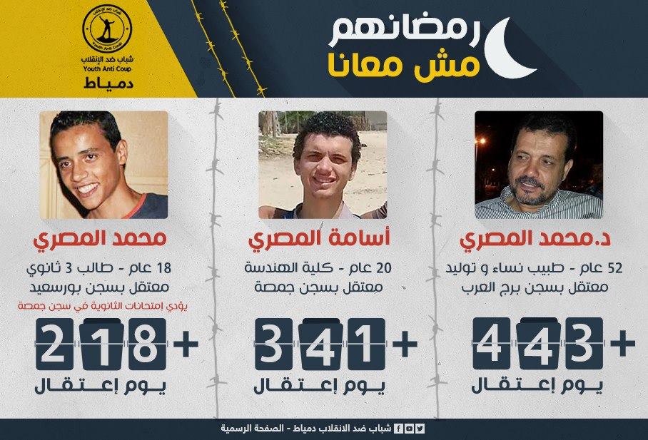 دشنت حركة “شباب ضد الانقلاب” بمحافظة دمياط، حملة بعنوان “رمضانهم مش معانا”؛ للتضامن مع المعتقلين الذين غيبتهم السجون عن ذويهم في شهر رمضان الكريم.