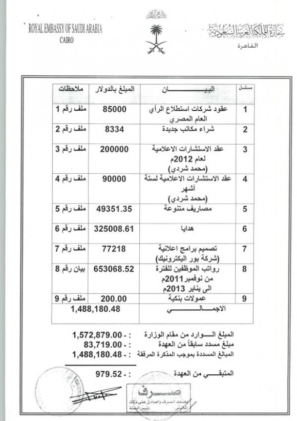 وبحسب الوثيقة التي تضمنت فاتورة ليست واضحة التاريخ، فإن شردي تقاضى -سرًا- من السفارة السعودية في مصر، مبلغ 90 ألف دولار نظير “استشارات إعلامية” قدمها للسفارة، بحسب ما كتبت السفارة على فاتورة الصرف، دون أي توضيح لطبيعة الاستشارات أو الخدمات التي قدمها للسفارة.