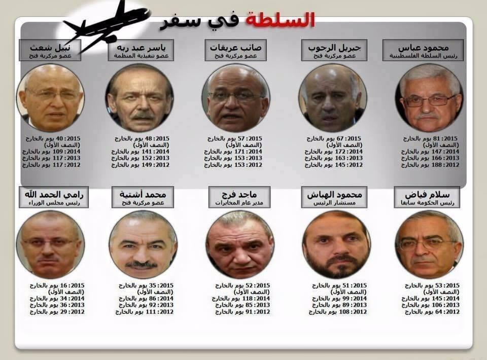 إضافة إلى عباس، فإن المسؤول عن ملف المفاوضات في منظمة التحرير الفلسطينية، صائب عريقات، ورئيس الاتحاد الفلسطيني لكرة القدم، جبريل الرجوب، يقضيان نحو 150 يومًا في كل سنة خارج مناطق السلطة الفلسطينية، ويتصدر قمة الرحلات الجوية كل من ياسر عبد ربه، نبيل شعث، ورئيس الحكومة سابقًا، سلام فياض، فضلًا عن رئيس حكومة التوافق رامي الحمد الله.