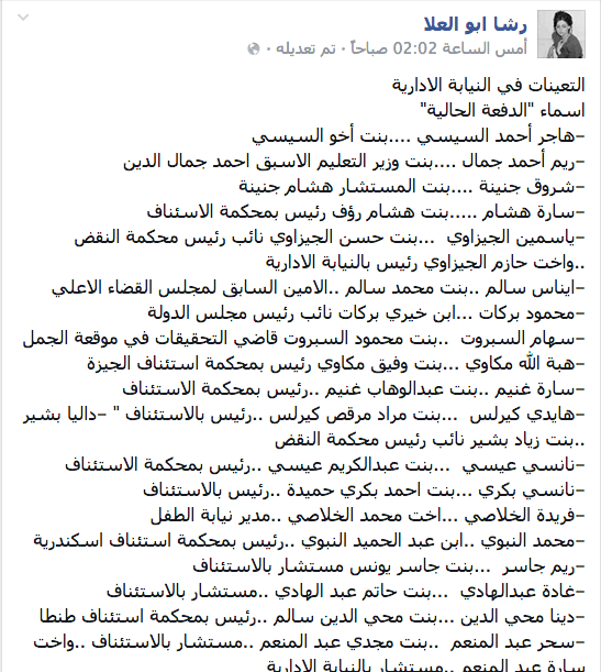 والمعينون هم: “هاجر أحمد السيسي، ابنة شقيق السيسي، ريم أحمد جمال ابنة وزير التعليم الأسبق أحمد جمال الدين، شروق جنينة، ابنة المستشار هشام جنينة، سارة هشام، ابنة هشام رؤوف رئيس بمحكمة الاسئناف، ياسمين الجيزاوي، ابنة حسن الجيزاوي نائب رئيس محكمة النقض، وشقيقة حازم الجيزاوي رئيس بالنيابة الإدارية، وإيناس سالم، ابنة محمد سالم، الأمين السابق لمجلس القضاء الأعلي.
