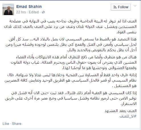 أكد الدكتور عماد شاهين، الأستاذ الزائر بجامعة جورج تاون، والمحكوم عليه بالإعدام في قضية التخابر والهروب الكبير غيابيًا، أن عبدالفتاح السيسي يسعى لأن يصل بالبلاد لدرجة من العنف، تصب في النهاية من أجل استمراره في الحكم واستتباب الأمور حوله.