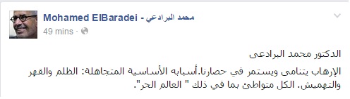 وأضاف البرادعي، في منشور له عبر صفحته الرسمية على موقع “فيس بوك”، أن “الإرهاب يتنامى ويستمر في حصارنا، أسبابه الأساسية المتجاهلة: الظلم والقهر والتهميش.. الكل متواطئ بما في ذلك العالم الحر”.