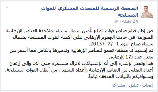 واعلن المتحدث العسكري -في بيان سابق- أن عددًا من العناصر يقدر عددها بنحو 70، قاموا بمهاجمة 5 أكمنة بقطاع تأمين شمال سيناء.