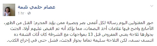 وقال تليمة، في منشور عبر صفحته على موقع “فيس بوك”: “صور المقتولين اليوم رسالة لكل أعمى بصر وبصيرة ممن يؤيد المجرم: القتل من الظهر، الأصابع واضح فيها علامات أخذ البصمات، مما يؤكد أنه تم القبض عليهم أولا، الجثث بجوارها ثلاجة، يعني المفروض قتل 13 بمواجهات مع الشرطة كان أثاث الشقة ده اتنسف نسف، لكن الثلاجة سليمة تماما بجوار الجثث، فشل حتى في إخراج الكذب”.