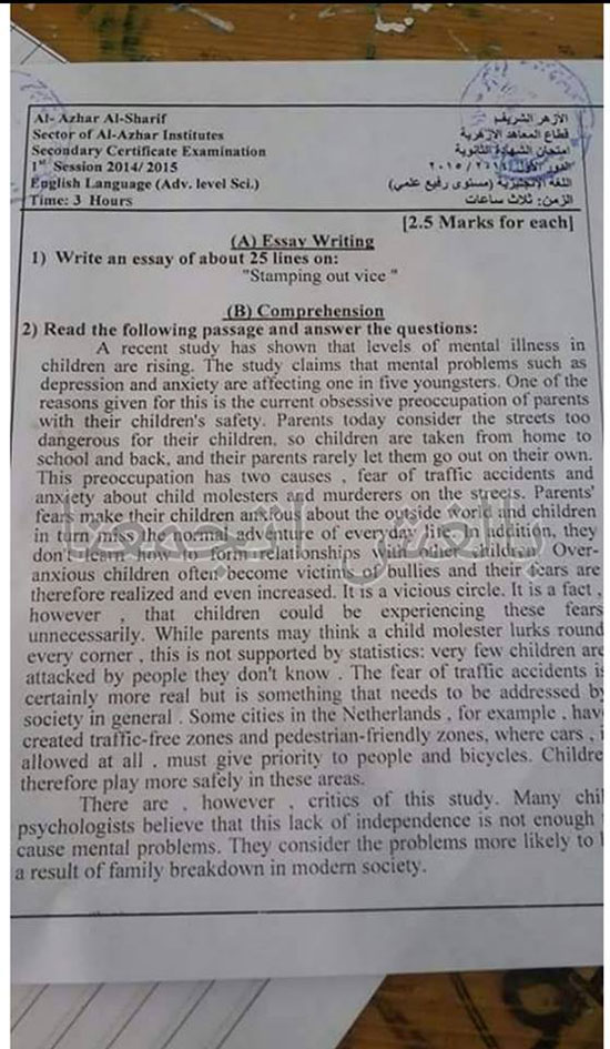 تداول مستخدمو موقع التواصل الاجتماعي “فيس بوك”، ورقة لامتحان المستوى الرفيع للقسم العلمي للثانوية الأزهرية، بعد عشر دقائق من بدء اللجنة فقط، في ختام امتحانات نهاية العام الدراسي، وكذلك صورة من ورقة أسئلة امتحان التوحيد للقسم العلمي لطلاب الثانوية الأزهرية.