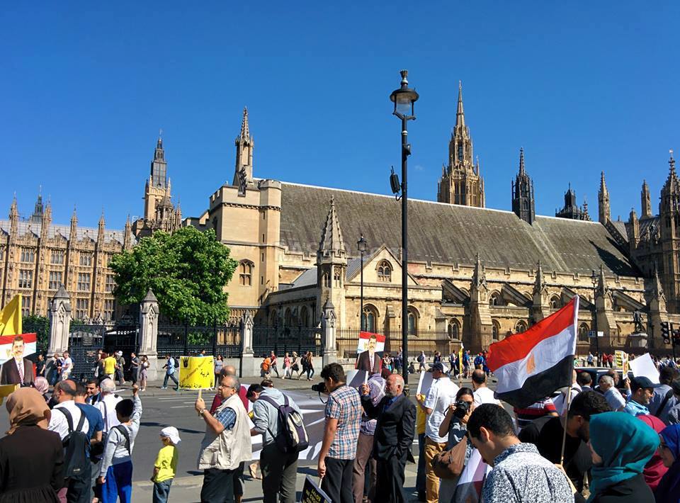 شهدت العاصمة البريطانية لندن اليوم السبت، مظاهرات منددة بحكم العسكر ورافضة للزيارة المزمعة لعبد الفتاح السيسي قائد الانقلاب العسكري إلى لندن، ورغم ارتفاع درجة الحرارة ووصولها لـ٣٥ درجة موية، لم يثن ذلك المشاركين عن الوقوف لأكثر من ساعة.