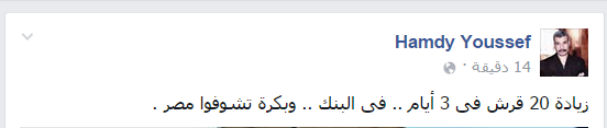 وعلق Hamdy Youssef: “زيادة 20 قرش في 3 أيام.. في البنك.. وبكره تشوفوا مصر”.