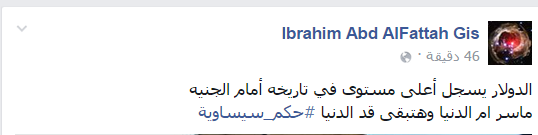 وقال Ibrahim Abd AlFattah Gis: “الدولار يسجل أعلى مستوى في تاريخه أمام الجنيه، ماسر أم الدنيا وهتبقى قد الدنيا”.