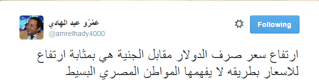 ورأى عَمْرُو عبدالهادي، عضو جبهة الضمير، عبر “تويتر”، “أن ارتفاع سعر صرف الدولار مقابل الجنيه هو بمثابة ارتفاع للأسعار بطريقة لا يفهمها المواطن المصري البسيط”.
