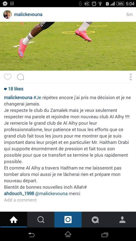 “أكرر مرة أخرى أنني اتخذت قراري ولن يتغير أبدا.. أنا أحترم نادي الزمالك، ولكن أريد فقط أن يحترموا رغبتي، بالانضمام إلى الأهلي، أشكر ذلك النادي الكبير، هو فريقي الجديد، بسبب الصبر الطويل الذي ظهر لي أنني مهم في مشروعهم خاصة هيثم عرابي”.