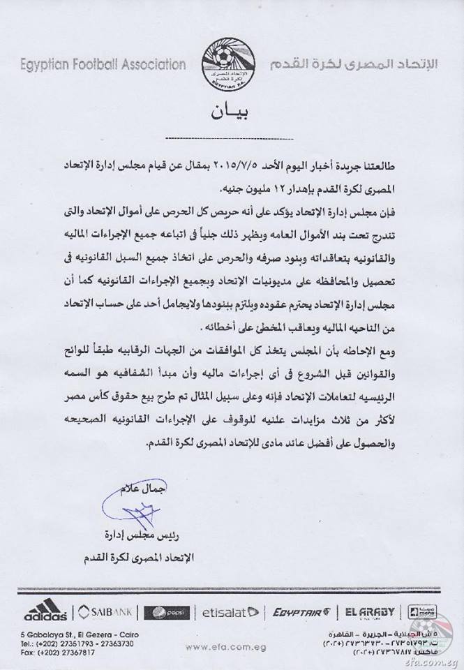 وقال علام -في البيان الرسمي- إن المجلس الحالي حريص جدًا في الحفاظ على أموال اتحاد الكرة، نافيًا وجود أي إهدار للمال العام.