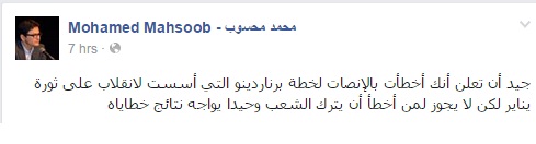 وقال “محسوب”، في منشور عبر صفحته على موقع التواصل الاجتماعي “فيس بوك”: “جيد أن تعلن أنك أخطأت بالإنصات لخطة برناردينو التي أسست لانقلاب على ثورة يناير، لكن لا يجوز لمن أخطأ أن يترك الشعب وحيدا يواجه نتائج خطاياه”.