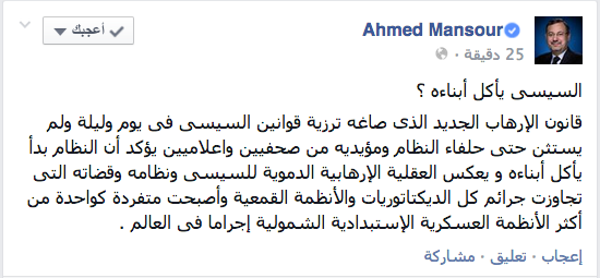 قال الإعلامي ومقدم البرامج على قناة الجزيرة الإخبارية “أحمد منصور” إن قانون الإرهاب الجديد الذي صاغه ترزية قوانين السيسي في يوم وليلة ولم يستثن حتى حلفاء النظام ومؤيديه من صحفيين وإعلاميين، يؤكد أن النظام بدأ يأكل أبناءه ويعكس العقلية الإرهابية الدموية للسيسى ونظامه وقضاته”.