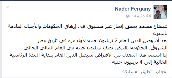 ونقل عن “الشروق” خبر نشرته -عبر صفحتها- بأن الحكومة تقترض نصف تريليون جنيه في العام المالي الحالي، معقبًا: “إذا استمر هذا المعدل من الاقتراض سيصل الدين العام بنهاية المدة الرئاسية الحالية إلى 4 تريليونات جنيه“.