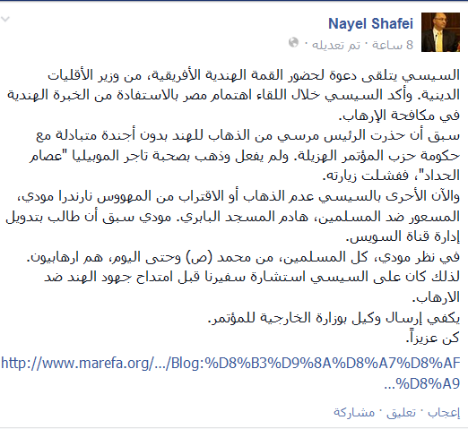 وقال -عبر منشور له على “فيس بوك”-: “السيسي تلقى دعوة لحضور القمة الهندية الإفريقية، من وزير الأقليات الدينية، وعبر السيسي عن اهتمام مصر بالاستفادة من الخبرة الهندية في مكافحة الإرهاب.”